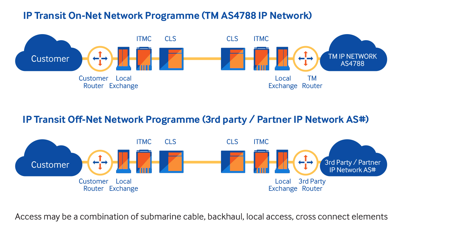 IP Transit is offered with dedicated access link to customers from TM's Point of-Presence (PoP) with speeds ranging from 2Mbps up to 100Gbps. Available access options include Submarine Cable Systems, Satellites, MPLS, Ethernet as well as via in-country local leased circuits and Layer 2 VPN tunnelling with SONET / SDH and Ethernet-based platform.